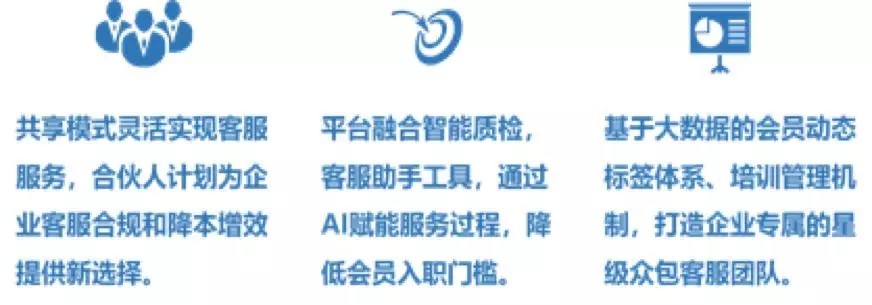 平臺(tái)具備眾包運(yùn)營(yíng)、云端平臺(tái)、質(zhì)量管控、培訓(xùn)認(rèn)證、精準(zhǔn)營(yíng)銷、智能客服六大功能要素。通過AI賦能共享,實(shí)現(xiàn)市場(chǎng)人力資源與企業(yè)客服需求的高低峰匹配。