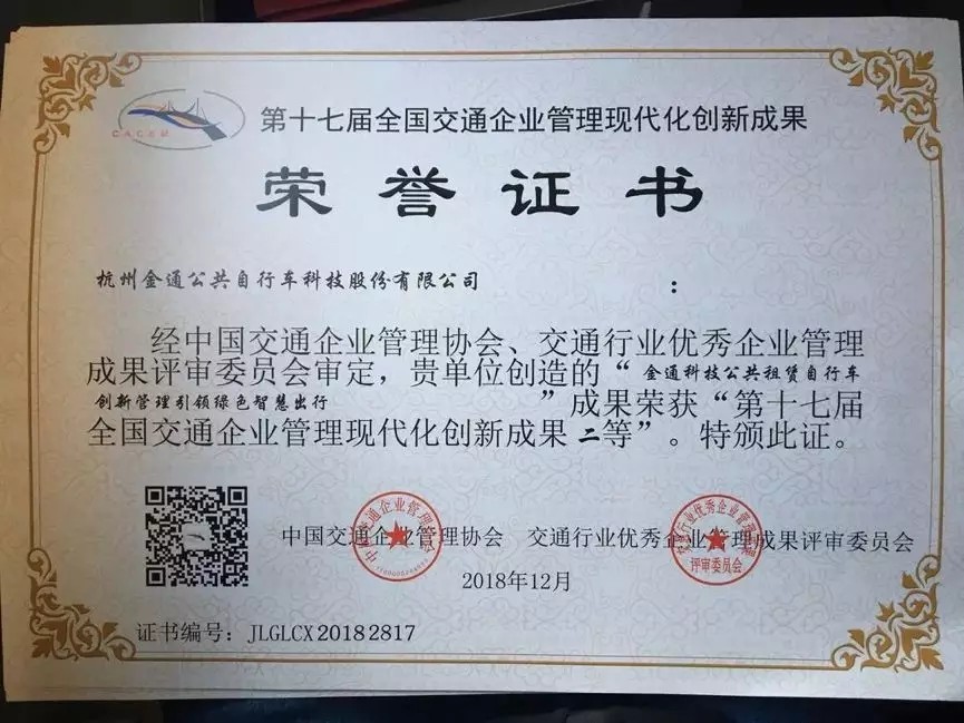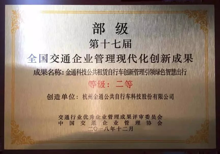 2019年3月14日,中國交通企業(yè)管理協(xié)會(huì)在山東濟(jì)南市召開了“第十七屆交通企業(yè)管理創(chuàng)新年會(huì)”。會(huì)上公布了第十七屆全國交通企業(yè)管理現(xiàn)代化創(chuàng)新成果和示范單位,并對(duì)獲獎(jiǎng)單位和主創(chuàng)人進(jìn)行了授牌,金通集團(tuán)提交的《金通科技公共租賃自行車創(chuàng)新管理引領(lǐng)綠色智慧出行》榮獲第十七屆全國交通企業(yè)管理現(xiàn)代化創(chuàng)新成果二等獎(jiǎng)。